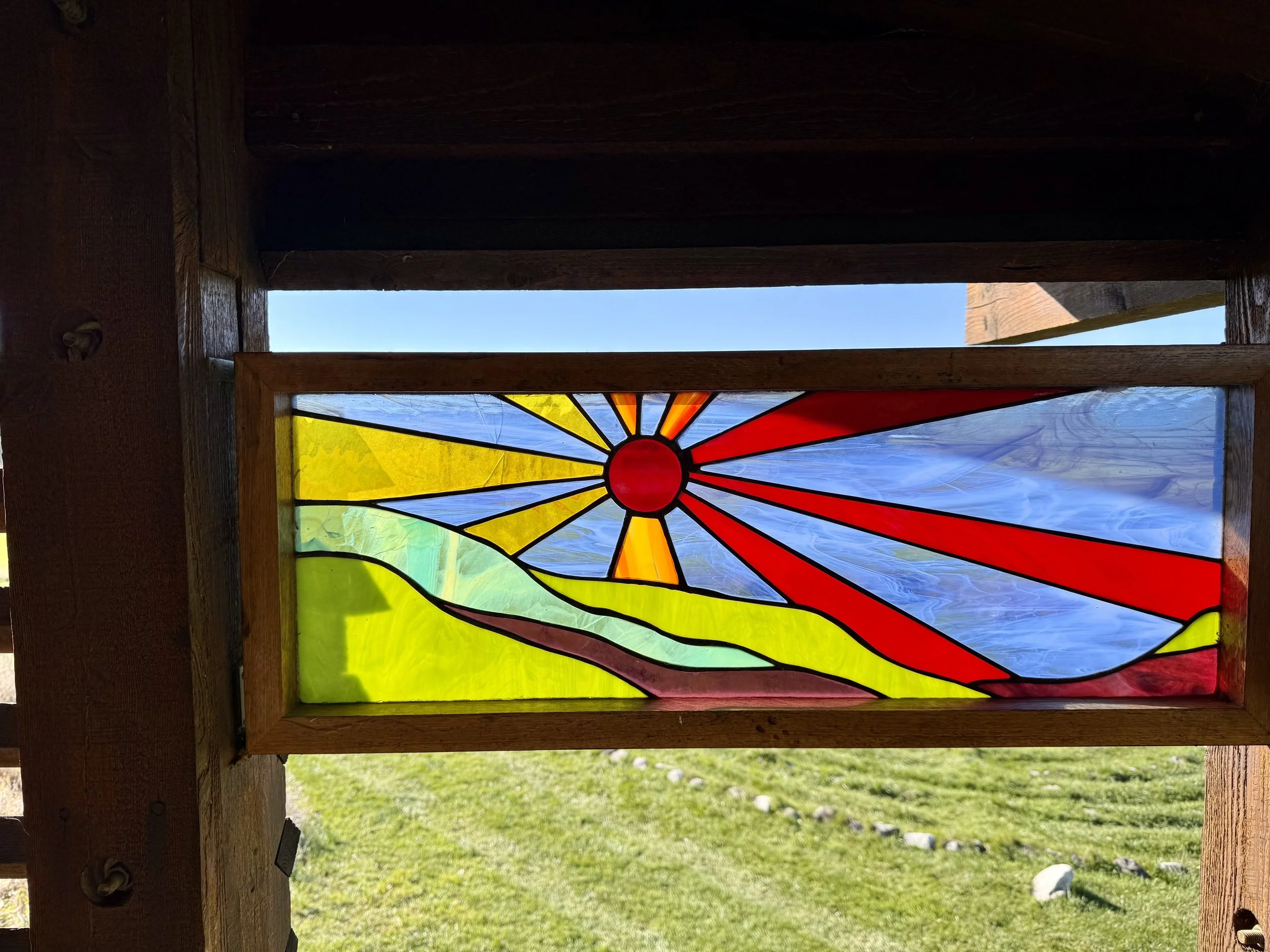 Stain glass windows in a structure at the Knoll, Middlebury College organic garden